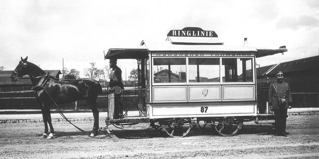Im Jahre 1890 werden in München Trambahnen noch von Pferden gezogen.